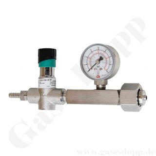 Flaschenanschlussventil / Membranventil mit Manometer DIN 477-1 Nr. 6 - Eingang W 21,8x1/14" IG ÜM - Ausgang 6 mm KRV - max. 13 bar - einsetzbar u.a. für Ammoniak - Edelstahl - GCE DRUVA FAV50037