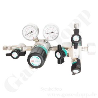 Flaschendruckminderer Chlor Chlorgas - 12 bar 1-stufig bis 2,0 bar regelbar - Anschluss W 1" DIN 477-1 Nr.8 - Ausgang 1/4" NPT IG mit Absperrventil - Fremdgasspülung - FKM - 3 m³/h - Edelstahl 6.0 - GCE Druva - CSLLVSJ
