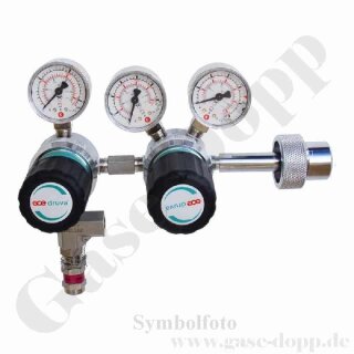 Flaschendruckminderer Prüfgas 200 bar 2-stufig bis 100 bar regelbar - Anschluss M19x1,5 LH DIN 477-1 Nr.14 - Ausgang 6 mm KRV - Sondermontage - FKM - Messing verchromt 6.0 - GCE Druva CPLH0SJ