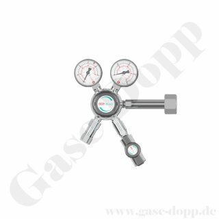 Flaschendruckminderer Prüfgas 200 bar 2-stufig bis 6,0 bar regelbar - Anschluss M19x1,5 LH DIN 477-1 Nr.14 - Ausgang 6 mm KRV - Fremdgasspülung - Edelstahl 6.0 - FKM - GCE Druva CSLH0DJ